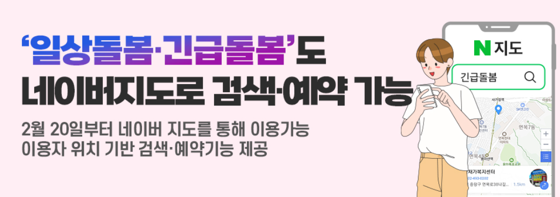이제 내 주변의 사회서비스 바우처 제공기관, 네이버 지도로 검색·예약하세요! 일상돌봄·긴급돌봄 바우처 이용자(약 12,000명)가 바우처를 활용하는 700여 개의 제공기관 정보를 네이버 지도로 검색·선택·예약하는 것이 가능해졌습니다.
