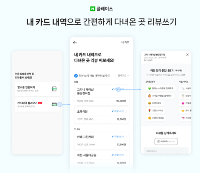 네이버는 MY플레이스와 네이버페이의 자산관리 서비스를 연동하여, 사용자가 영수증 없이도 카드 이용 내역만으로 방문한 장소에 대한 리뷰를 작성할 수 있도록 개선했습니다. 이를 통해 사용자는 영수증을 챙기지 못하더라도 카드 결제 내역을 기반으로 리뷰를 남길 수 있으며, 다양한 미션 이벤트에도 참여할 수 있습니다. 이 기능은 네이버페이 내 자산 서비스에 등록된 카드의 최대 3개월간의 이용 내역을 활용하여 음식점, 카페, 미용실 등에서 리뷰 작성이 가능합니다.