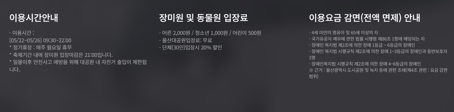 - 장미원 및 동물원 입장료: 어른 2000원/ 청소년 1000원/ 어린이 500원
