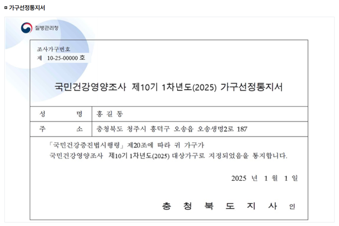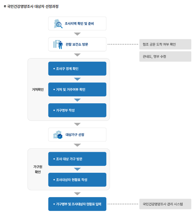 국민건강영양조사는 질병관리청에서 매년 전국적으로 실시하는 법정 조사입니다. 통계적 방법을 이용하여 무작위로 선정된 4,800가구의 1세 이상 가구원이 조사 대상이 됩니다. 선정된 가구에는 사전 안내문이 우편 또는 전화로 전달되며, 조사 일정과 내용이 상세히 안내됩니다.