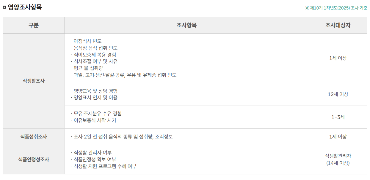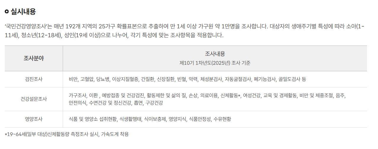 국민건강영양조사는 국민건강증진법 제16조에 따라 매년 질병관리청에서 시행하는 국가 법정 조사입니다. 국민 건강 상태 및 식생활 패턴을 종합적으로 분석하여 정부가 효과적인 보건 정책을 수립하는 데 필요한 자료를 제공하는 것이 주된 목적입니다.