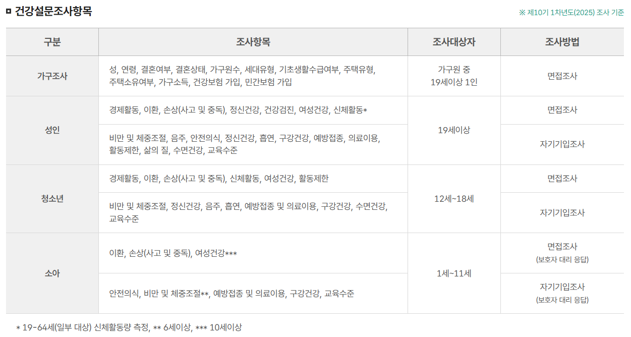조사는 건강 설문조사, 검진 조사, 영양 조사 등으로 구성되며, 약 400여 개의 항목이 포함됩니다. 이를 통해 정부는 국민의 주요 질병 유병률, 건강 행태, 영양 섭취 수준 등을 분석하고 이를 정책 수립 및 평가에 활용합니다.
