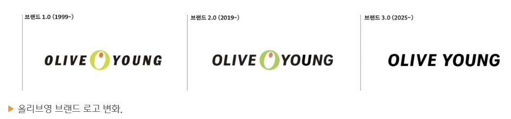 올리브영은 글로벌 사업 확장과 옴니채널 전략에 맞춰 브랜드 로고를 리뉴얼하였습니다. 기존 텍스트 사이에 올리브 심볼을 넣은 로고에서, 심볼을 제거하고 'OLIVE YOUNG' 워드마크형 로고를 단독 사용하여 가시성과 영문 가독성을 높였습니다. 이는 해외 온오프라인 사업 강화와 국내 매장을 찾는 글로벌 관광객 증가를 고려한 결정입니다.