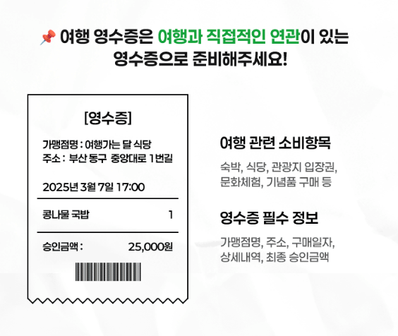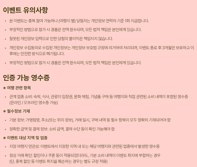 여행 중 촬영한 사진과 해당 지역에서의 소비를 증명하는 영수증을 준비합니다. 이벤트 페이지에 접속하여 사진과 영수증을 업로드합니다.