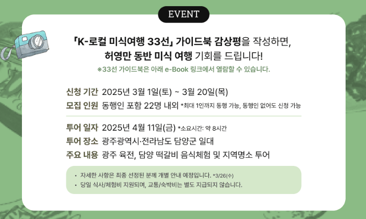 - 신청 방법: 'K-로컬 미식여행 33선' 가이드북 감상평 제출