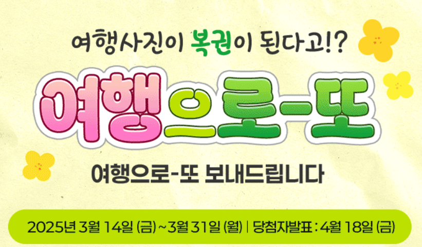 '여행으로-또' 이벤트는 문화체육관광부와 한국관광공사가 주관하는 행사로, 2025년 3월 한 달 동안 국내 여행을 촉진하고자 기획되었습니다. 참여자들은 여행 사진과 해당 지역의 영수증을 제출함으로써 이벤트에 참여할 수 있으며, 다양한 혜택을 받을 수 있습니다.
