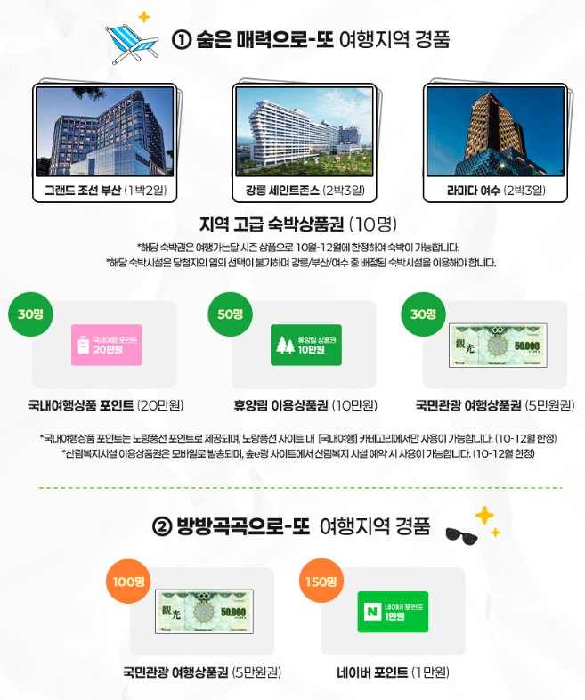 추첨을 통해 다양한 경품이 제공됩니다. 강릉, 부산, 여수 등지의 숙박권 국내 여행상품 포인트 산림복지시설 이용 상품권 등. 자세한 사항은 홈페이지를 참고 바랍니다.