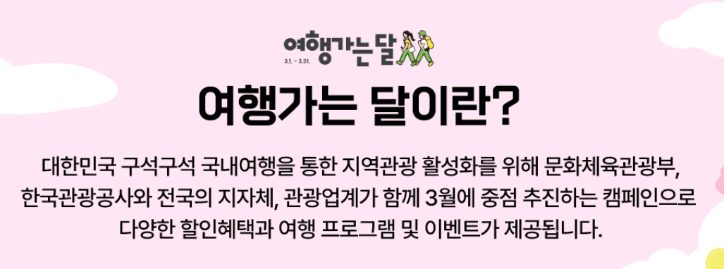 "여행가는 달" 캠페인은 한국의 국내 여행을 활성화하고, 지역 경제를 지원하기 위해 문화체육관광부와 한국관광공사, 그리고 여러 지자체가 협력하여 추진하는 중요한 이니셔티브입니다. 이 캠페인은 매달 다양한 테마와 이벤트를 통해 여행자들에게 특별한 경험을 제공하고, 한국의 아름다운 자연과 문화유산을 탐방할 수 있는 기회를 마련합니다.