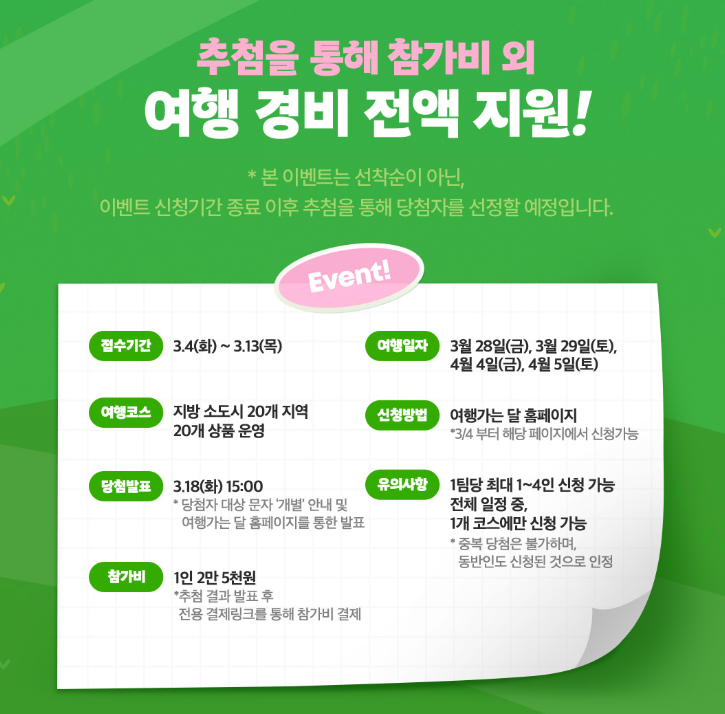 - 문의 사항: 이벤트 관련 문의는 '여행가는 달' 공식 누리집의 문의 게시판을 이용하거나, 안내된 연락처로 문의 가능합니다.