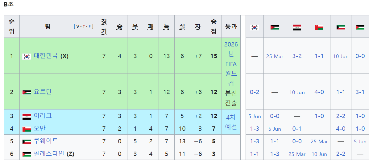 2026 FIFA 북중미 월드컵 예선 조별 순위
