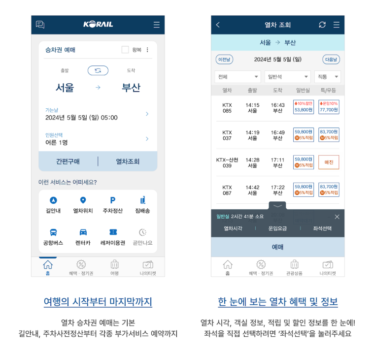 승차권 예매의 경우, 출발지와 도착지, 날짜와 시간을 입력하여 검색한 후, 원하는 열차와 좌석을 선택하여 결제하면 됩니다. 예매한 승차권은 '승차권 확인' 메뉴에서 확인할 수 있으며, 탑승 시 제시하면 됩니다.