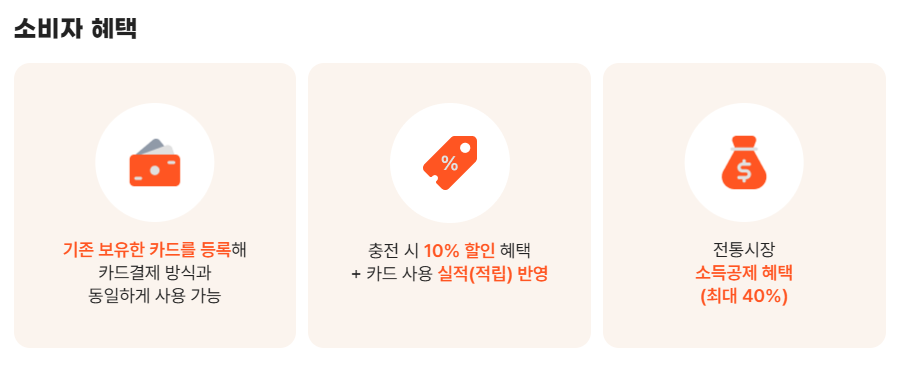 또한, 충전시 카드 사용 실적이 반영되며 상품권 사용 금액은 최대 40%까지 소득공제 혜택을 받을 수 있어 세금 절약 효과도 기대할 수 있습니다.