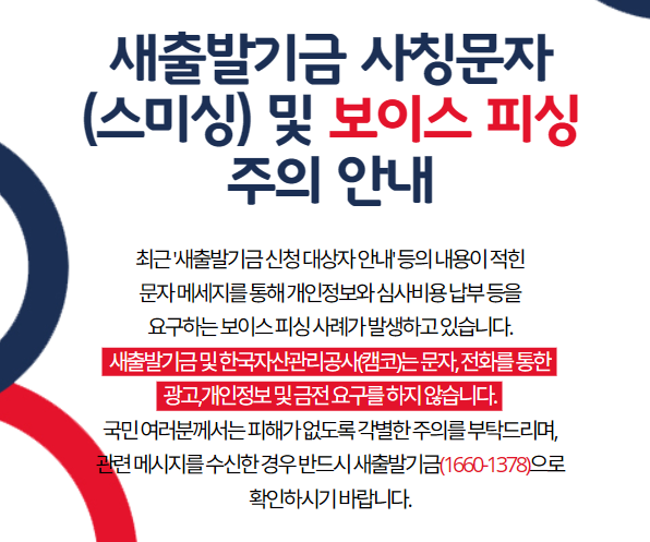 새출발기금 사칭문자(스미싱) 및 보이스 피싱 주의 안내