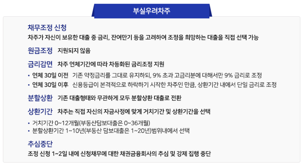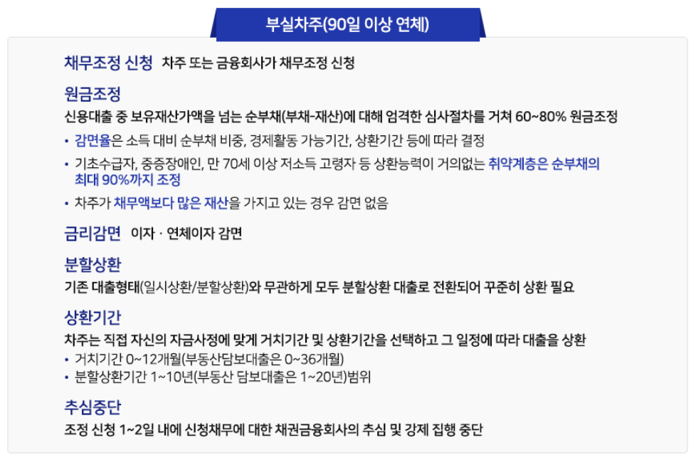 - 취약계층: 기초수급자 등 상환능력이 거의 없는 경우, 순부채의 최대 90%까지 조정