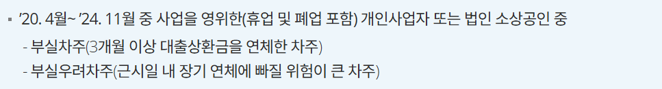 지원 대상은 부채 상황에 따라 '부실차주'와 '부실우려차주'로 구분됩니다. 부실차주는 자금 지원을 90일 이상 연체한 경우로, 채무 상환이 사실상 불가능한 상태에 이른 차주를 의미합니다. 반면, 부실우려차주는 아직 장기 연체는 발생하지 않았지만, 최근 경제적 어려움으로 인해 연체 가능성이 높은 차주를 의미합니다.