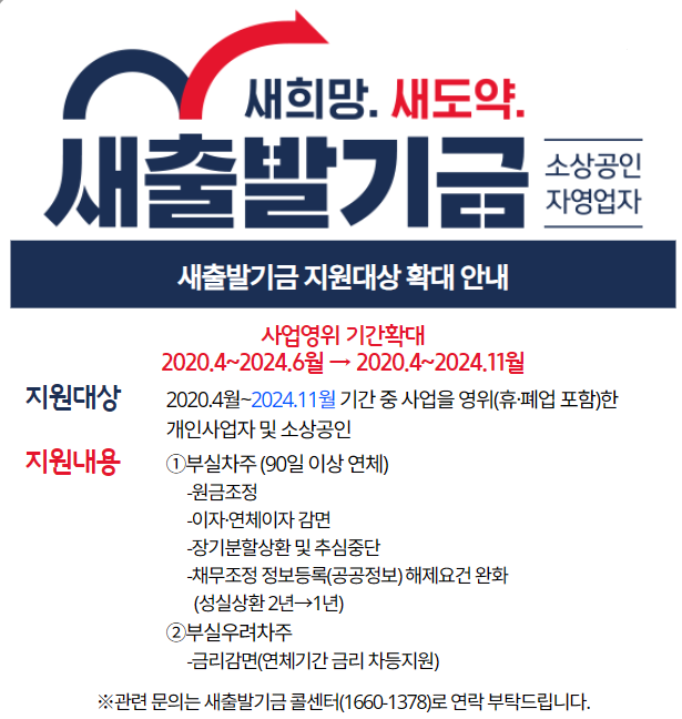 새출발기금은 기존보다 지원 범위와 혜택이 확대되었습니다. 첫 번째로, 사업 운영 기간이 기존보다 연장되어 2024년 11월까지 운영한 사업자도 신청할 수 있게 되었습니다.