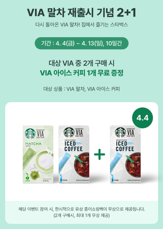 스타벅스의 인기 제품인 VIA 말차가 재출시를 기념하여 2+1 이벤트를 진행 중입니다. 이벤트 기간 동안 VIA 말차 제품을 2개 구매하시면 동일한 제품을 하나 더 드립니다. 간편하게 말차를 즐기실 수 있는 기회, 놓치지 마세요.