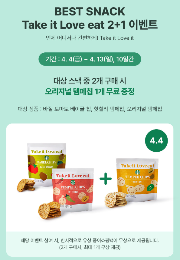 스타벅스에서는 'Best Snack Take it Love eat' 프로모션을 통해 인기 스낵 제품을 2+1 혜택으로 제공하고 있습니다. 이벤트 기간 동안 해당 스낵 제품을 2개 구매하시면 동일한 제품을 하나 더 드립니다. 자세한 이벤트 기간과 대상 제품은 스타벅스 공식 홈페이지를 통해 확인하실 수 있습니다.