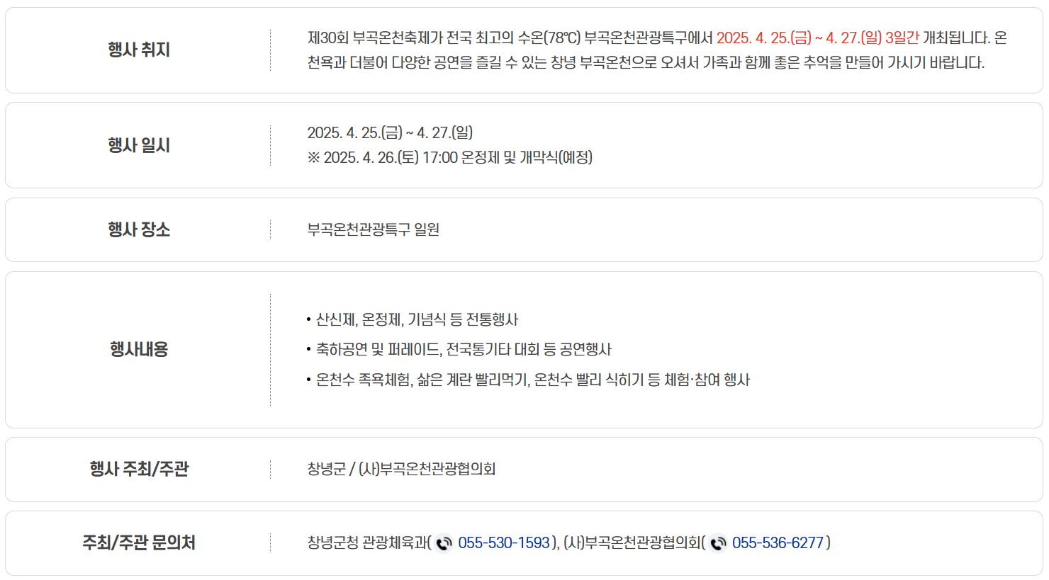 경남 창녕에서 열리는 ‘부곡온천축제’는 2025년 4월 25일부터 27일까지 개최됩니다. 국내에서 가장 높은 온도인 78도의 온천수를 자랑하는 부곡온천은 오랜 세월 동안 사랑받아온 힐링 명소입니다.