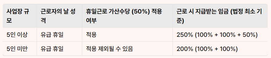 5인 미만 사업장: 상시 근로자 수가 5인 미만인 사업장의 경우, 근로기준법의 휴일근로 가산수당 규정이 적용되지 않을 수 있습니다. 이 경우 유급 휴일 임금(100%)과 실제 근로한 시간에 대한 임금(100%)만 지급되어 총 200%가 지급될 수 있습니다. (단, 취업규칙이나 근로계약서에 별도 정함이 있다면 그에 따릅니다.)