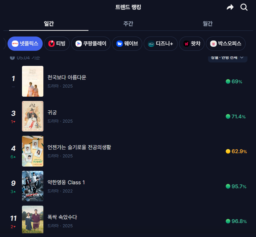 또한, 사채업에 맞서는 두 청년 복서의 이야기를 그린 통쾌한 액션 누아르 사냥개들은 높은 몰입도와 완성도로 호평을 받았고, 자폐 스펙트럼을 가진 천재 변호사의 성장과정을 따뜻하게 그린 이상한 변호사 우영우 또한 많은 시청자에게 감동과 재미를 선사하며 큰 사랑을 받았습니다. 이 외에도 최근 방영되어 폭발적인 인기를 얻은 로맨틱 코미디 눈물의 여왕 역시 높은 화제성과 시청률을 기록하며 넷플릭스에서도 상위권을 차지한 바 있습니다