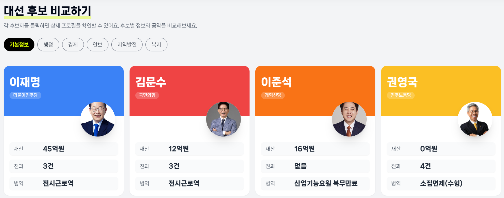 5월 12일 대통령 후보들의 10대 정책 및 공약이 발표되었습니다. 정책 및 공략을 보기 좋게 정리한 사이트를 소개합니다. 후보별 재산, 전과, 병역 정보 등 프로필과 정책에 대해 자세히 소개되어 있으니 참고바랍니다.
