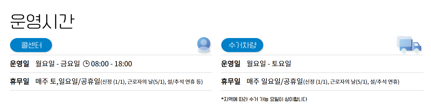 우선, 수거 예약은 최소 하루 전에는 완료해야 하며, 수거 당일 변경이나 취소는 제한될 수 있습니다. 콜센터 운영 시간은 평일 오전 8시부터 오후 6시 사이이며, 주말과 공휴일에는 진행되지 않습니다.