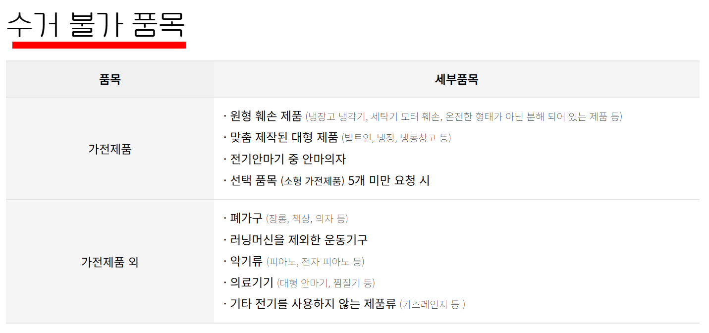 - · 에어컨, 벽걸이 TV, 빔프로젝터, 유무선공유기, 감시카메라 등 설치(고정)된 제품은 서비스 이용 전 기본 철거가 되어 있어야 수거가 가능합니다. (철거가 되지 않았을 경우, 수거가 불가능 합니다.)