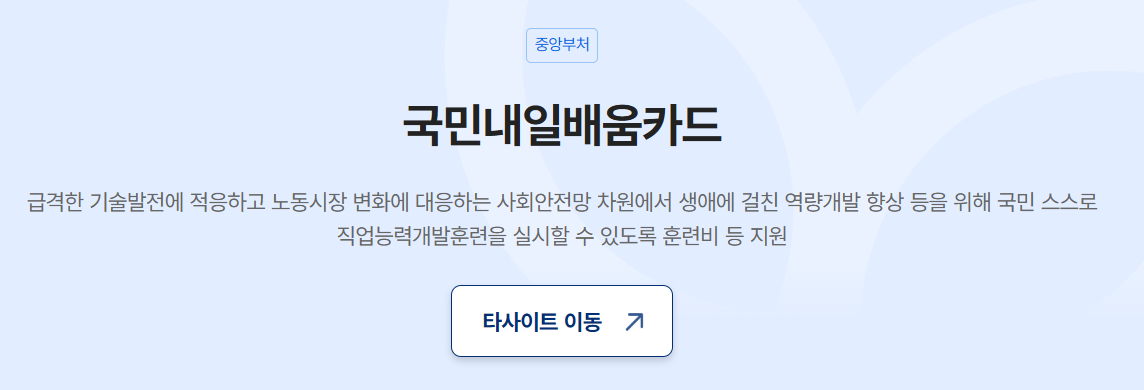 국민내일배움카드는 급변하는 산업 구조와 노동시장 환경 속에서 국민 개개인의 직업 능력 향상과 생애주기별 경력 개발을 지원하기 위해 고용노동부가 시행 중인 대표적인 평생직업능력개발 정책입니다. 4차 산업혁명과 디지털 전환, 저출산·고령화 사회 진입 등 사회구조 전반의 변화는 고용 불안정을 심화시키는 동시에 새로운 직업 역량에 대한 수요를 증가시키고 있습니다. 이러한 변화 속에서 국민내일배움카드는 국민 누구나 원하는 시점에 자신의 생애경력설계에 따라 직업훈련에 참여할 수 있도록 기회를 보장하고, 그에 대한 실질적인 재정적 지원을 통해 훈련의 문턱을 낮추는 데에 큰 의의가 있습니다.