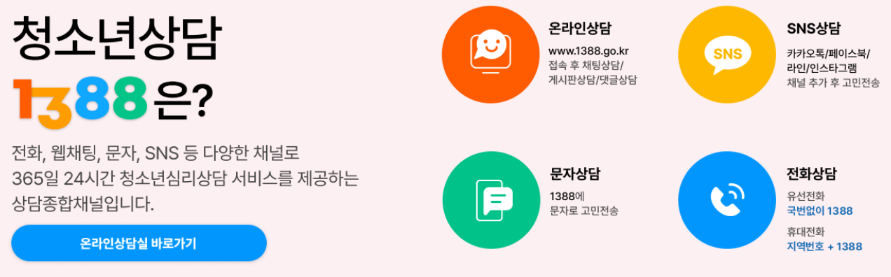 또한 청소년 사이버상담센터에서는 채팅과 이메일을 통해 실시간 상담을 제공하고, 청소년안전망인 Wee 프로젝트는 위기 상황에 처한 청소년에게 심리 상담과 정서적 지원을 제공합니다.