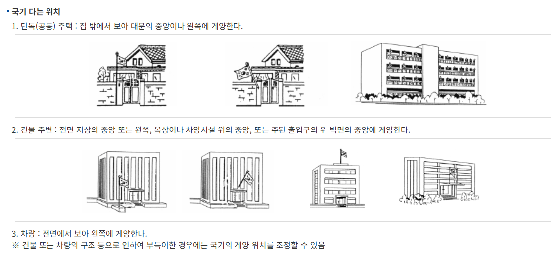 공공기관이나 기업체 건물에서는 출입구 위 중앙이나 옥상 차양 중앙, 또는 깃대 설치 장소의 중앙에 게양하는 것이 좋습니다. 이 외에도 차량의 경우에는 차량 전면 기준 왼쪽에 달아야 하며, 반드시 주행 중 국기가 안전하게 고정되어 흔들림 없이 보이도록 설치해야 합니다. 특별한 구조적 제약이 있는 경우에는 가능한 범위 내에서 국기를 돋보이게 하며, 다른 장애물이나 간판에 가리지 않도록 배치하는 것이 원칙입니다.