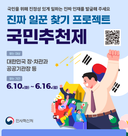 대통령실이 고위 공직자(장·차관, 공공기관장 등)에 대해 국민 추천을 받는 국민추천제를 2025년 6월 10일부터 일주일간 추진합니다. 국민의 참여로 진정한 실력을 갖춘 인재를 발굴하는 '진짜 일꾼 찾기 프로젝트'입니다.
