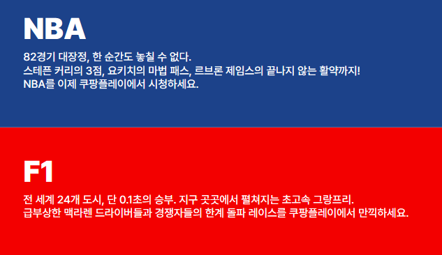 | 쿠팡플레이 | 스포츠 중계(해외 축구·F1·NBA 예정 등) | 티켓 예매, 4K 중계, 선예매 할인 |