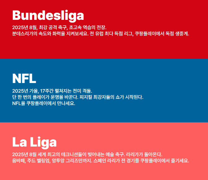 쿠플의 모든 스포츠를 스포츠 패스 하나로! 6월 15일 (일)부터 시작하세요. FIFA 클럽 월드컵, 프리미어리그, 분데스리가, F1, NBA, NFL, LIV 골프 등 경기 생중계, 하이라이트, 풀경기 다시보기까지!