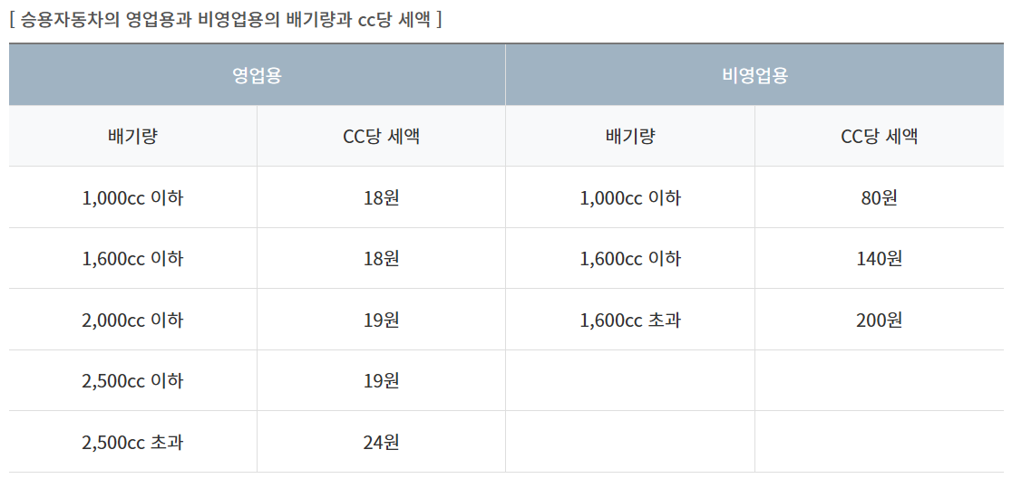 자동차세는 차량의 종류와 배기량, 중량 등에 따라 산정됩니다. 비영업용 승용차는 배기량 기준으로 계산되며, 1,000cc 이하는 cc당 80원, 1,000~1,600cc는 140원, 1,600cc 초과는 200원입니다.