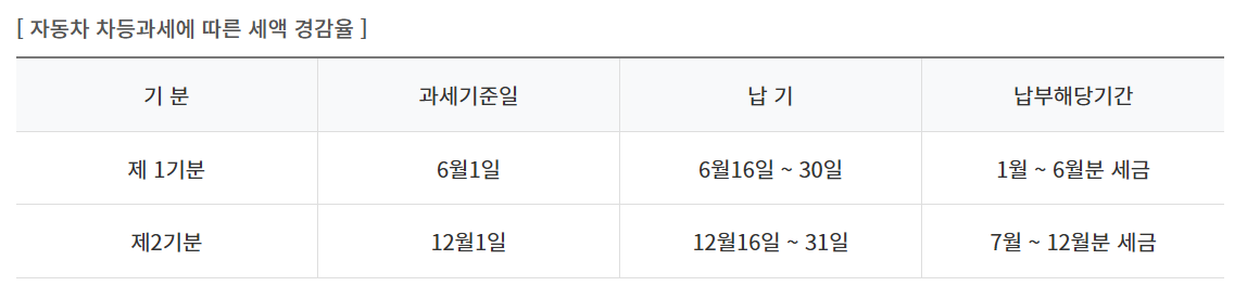 자동차세는 매년 6월과 12월 두 차례에 걸쳐 부과되며, 각 시기의 납부기간은 6월 16일부터 6월 30일까지, 12월 16일부터 12월 31일까지입니다. 단, 연세액이 10만 원 이하인 차량은 6월 한 번만 부과되는 일괄 납부 대상입니다.