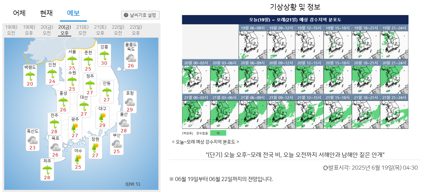 2025년 6월 현재, 대한민국은 본격적인 장마 시즌에 돌입한 상태로, 특히 이번 주말인 6월 21일(토)과 22일(일)에는 전국적으로 강한 비와 함께 천둥·번개를 동반한 뇌우가 예보되어 있습니다. 대구, 서울, 광주, 부산 등 주요 야구장이 위치한 지역 역시 흐리고 습한 날씨가 지속되며, 토요일부터 월요일까지는 시간당 20mm 이상의 강우가 예상되기도 합니다.