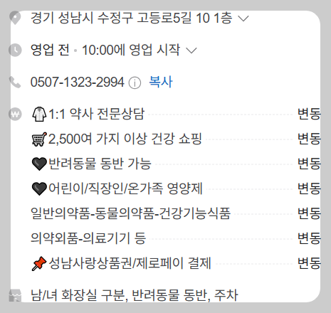 메가팩토리약국은 경기도 성남시 중원구에 위치해 있으며 인근에는 아파트 단지와 공업지역이 혼재해 상시 고객 유입이 가능한 지역적 이점을 갖고 있습니다. 매장은 실내 조명과 진열 방식이 대형 할인마트를 연상시키며, 방문객은 진열된 제품을 직접 선택하고 필요 시 약사에게 상담을 요청할 수 있습니다. 운영시간은 오전 10시부터 오후 9시까지이며, 일요일도 영업합니다.