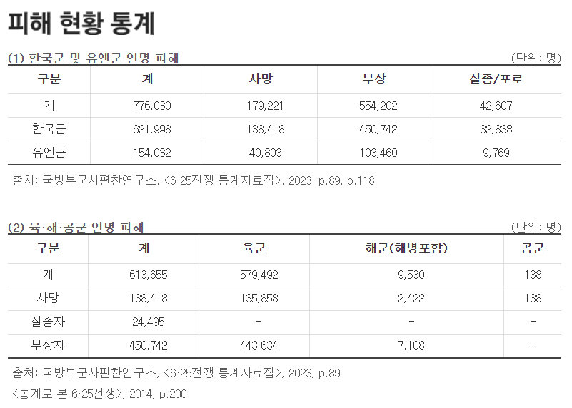 6.25 전쟁은 참혹한 인명 피해를 남겼습니다. 대한민국 국방부 통계에 따르면, 한국군 전사자는 약 13만 8천 명, 부상자는 45만여 명에 달합니다. 민간인 피해도 극심하여 사망·부상·실종된 민간인이 100만 명 이상으로 추정됩니다. 북한군과 중국군의 전사자 역시 수십만 명에 이르며, 미국을 비롯한 유엔군의 전사자는 약 4만 명, 부상자는 10만 명 이상으로 알려져 있습니다.