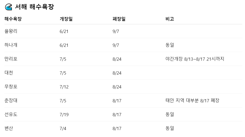 서해 해수욕장 개장일/폐장일