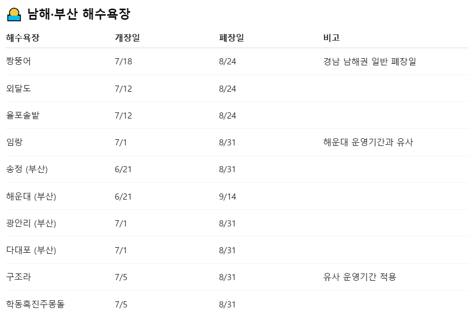 남해 해수욕장 개장일/폐장일