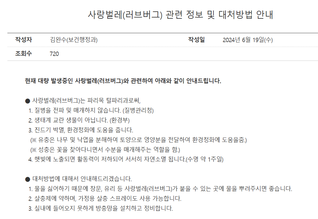 관할 지자체 확인: 가장 먼저 러브버그가 출몰한 지역의 구청 또는 시청 홈페이지에 접속하시거나 해당 구의 보건소에 문의하셔야 합니다. 지자체마다 방역 정책 및 신청 절차가 다를 수 있으므로, 정확한 정보를 해당 기관에서 확인하는 것이 중요합니다.