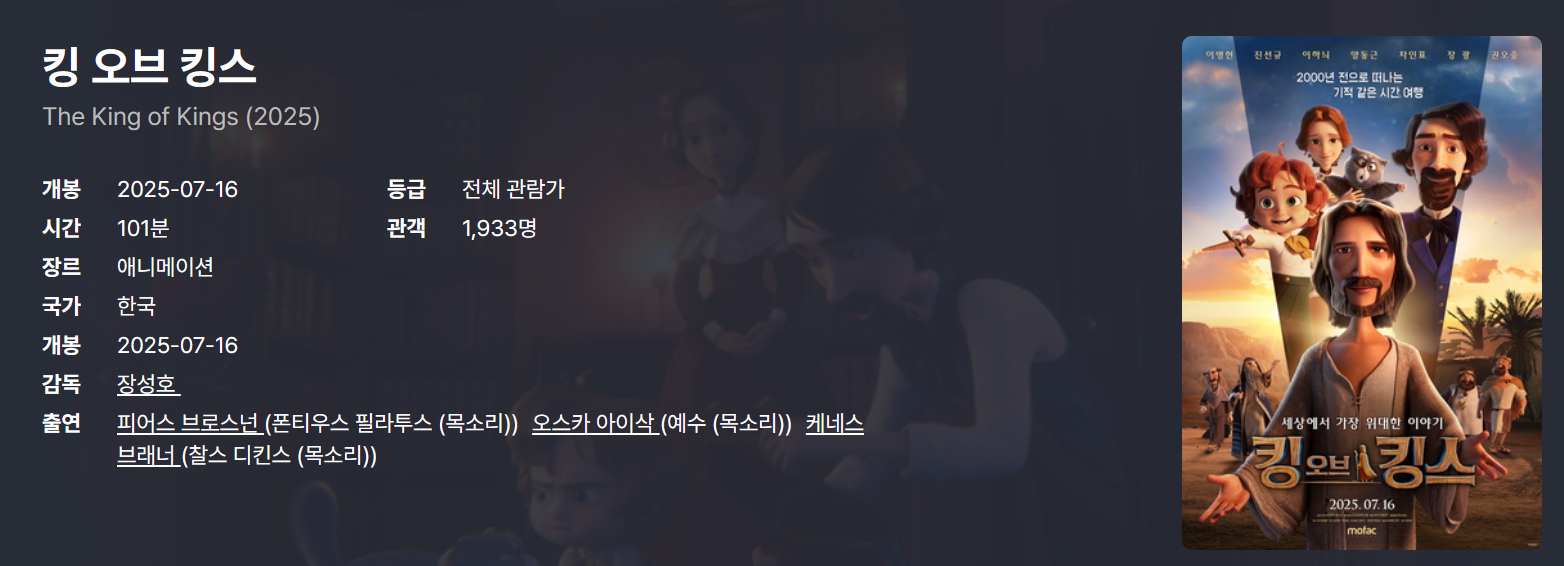 2025년 6월 개봉한 한국 애니메이션 ‘킹오브킹스’는 국내 애니메이션 산업의 새로운 이정표를 제시한 작품입니다. 성경의 서사를 현대적으로 재해석하면서도 최신 3D 그래픽과 국제적인 음향 연출, 더불어 국내 정상급 배우들의 더빙 참여를 통해 높은 완성도를 보여주었습니다. 특히 북미 시장에 정식 개봉한 최초의 한국 종교 애니메이션이라는 점은 매우 상징적인 의미를 갖습니다. 이는 한국이 문화 콘텐츠 생산국으로서 세계 무대에서 경쟁력을 충분히 갖추고 있다는 점을 입증한 사례라 할 수 있습니다.
