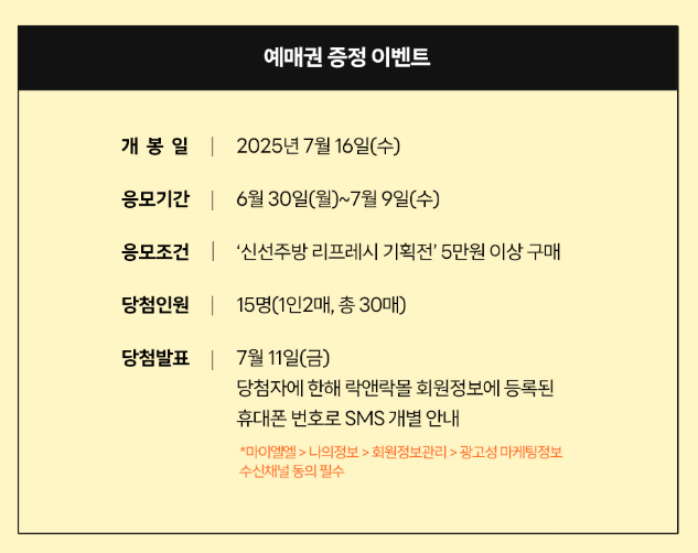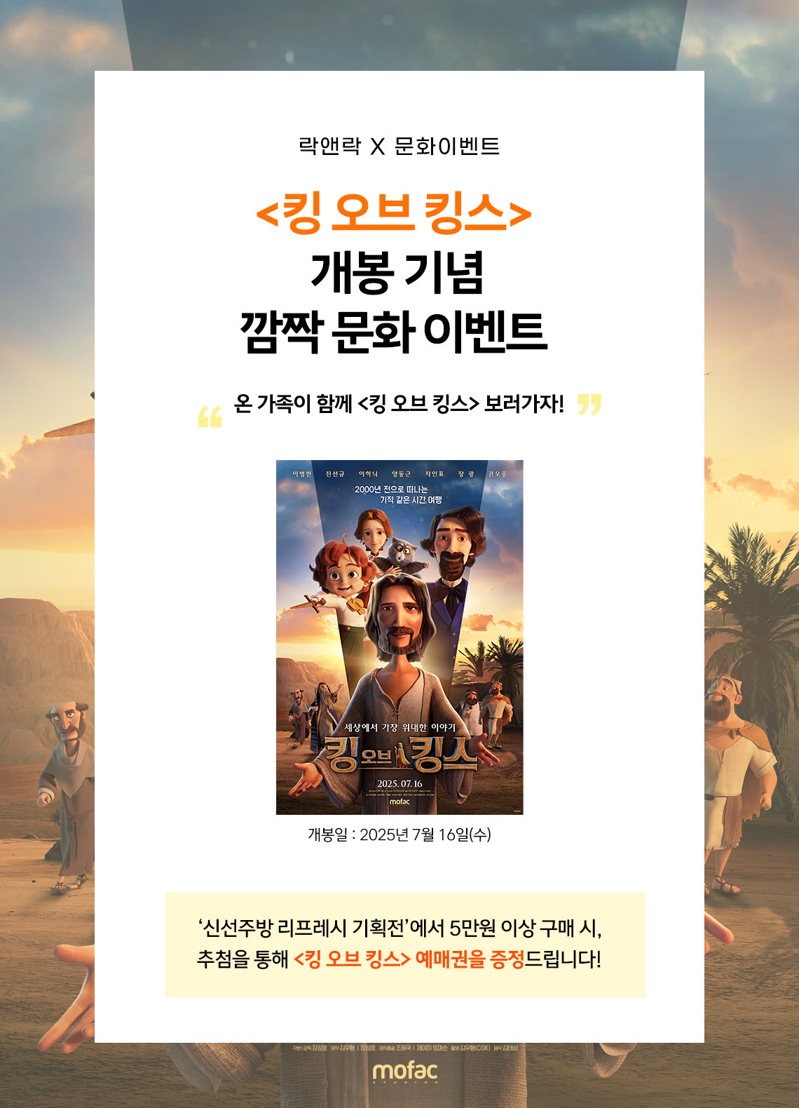 락앤락몰 예매권 증정 이벤트: 락앤락몰에서는 '신선주방 리프레시 기획전'에서 5만 원 이상 구매한 고객을 대상으로 '킹 오브 킹스' 예매권을 증정하는 이벤트가 진행중입니다. 이 이벤트는 ID당 1회 응모 가능하며, 당첨자 발표는 7월 11일에 예정되어 있습니다 .