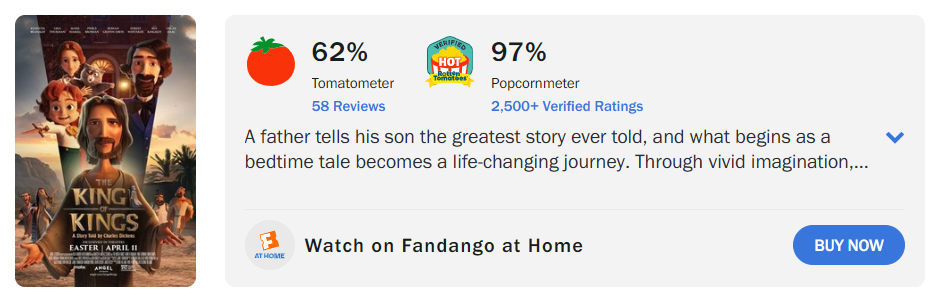 특히 찰스 디킨스의 '우리 주님의 생애'에서 영감을 받은 시나리오는 따뜻하고 친근한 방식으로 예수님의 이야기를 전달하며, 아버지와 아들의 관계 회복이라는 감성적인 서사를 통해 복음이 현실 속 삶을 변화시키는 살아있는 메시지로 각인되게 합니다. 이러한 감동적인 시나리오와 더불어, 10년에 걸친 제작 기간과 높은 수준의 버추얼 프로덕션 기술이 더해져 완성도 높은 작품으로 평가받으며 북미에서 시네마스코어 A+, 로튼토마토 팝콘 지수 98% 등 높은 평가와 흥행을 기록했습니다.
