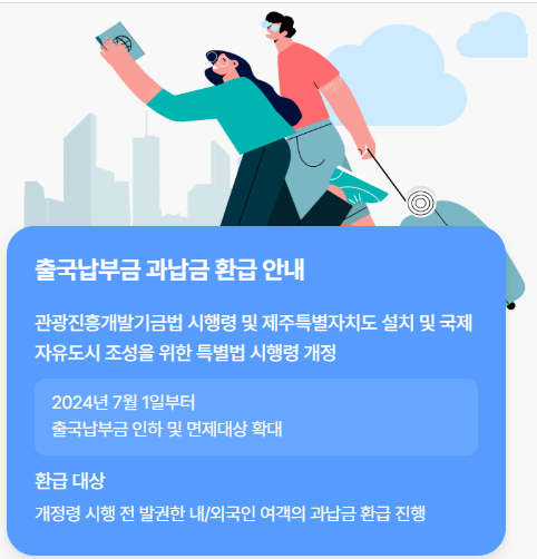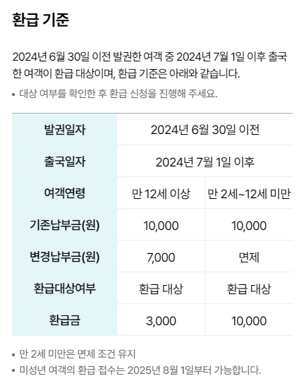 - 설명: 12세 미만 어린이의 경우 기존에는 출국납부금 10,000원이 부과되었으나, 2024년 7월 1일부터 면제 대상으로 변경되어 납부했던 10,000원 전액을 환급받을 수 있습니다.