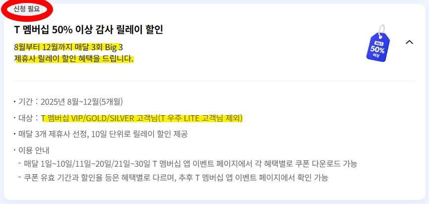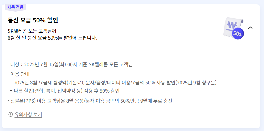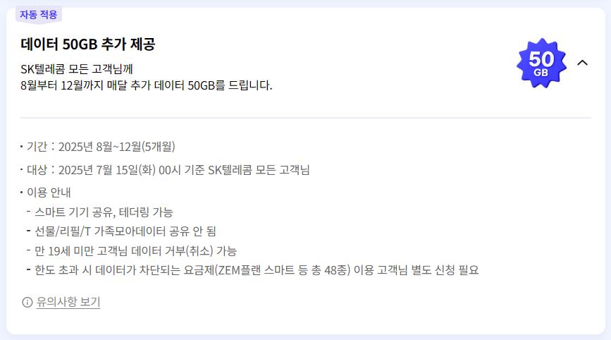 또한 SKT는 2) 3개월간 매달 50GB의 데이터를 추가로 제공해 이용자들의 불편함을 최소화하고 있습니다. 3) 일부 고객을 대상으로 8월부터 12월까지 제휴사 릴레이 할인 혜택도 주어질 예정입니다.