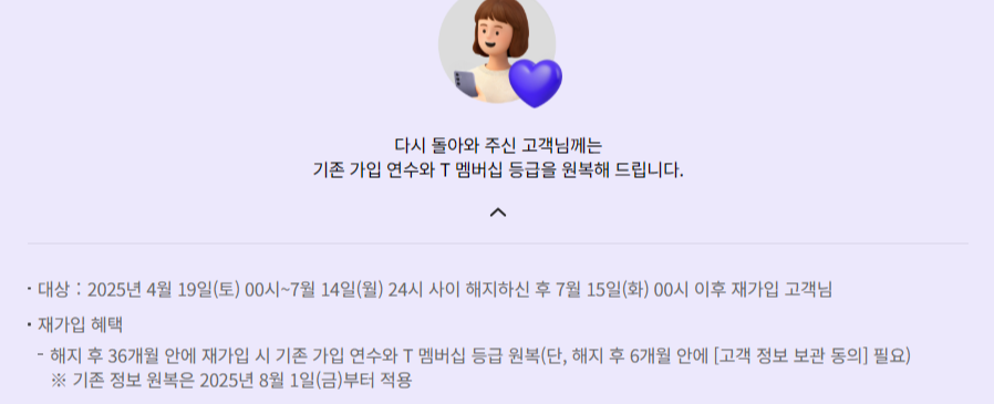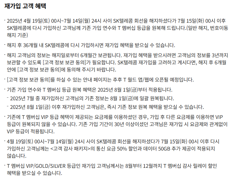 특히 타 통신사로 일시적으로 이동한 후 다시 SKT로 돌아오는 고객에 대해서는 해지일로부터 6개월 이내 재가입 시 기존 가입 연수, 멤버십 등급, 마일리지 등 고객 혜택을 모두 원상복구해주는 조건을 제시하고 있습니다.