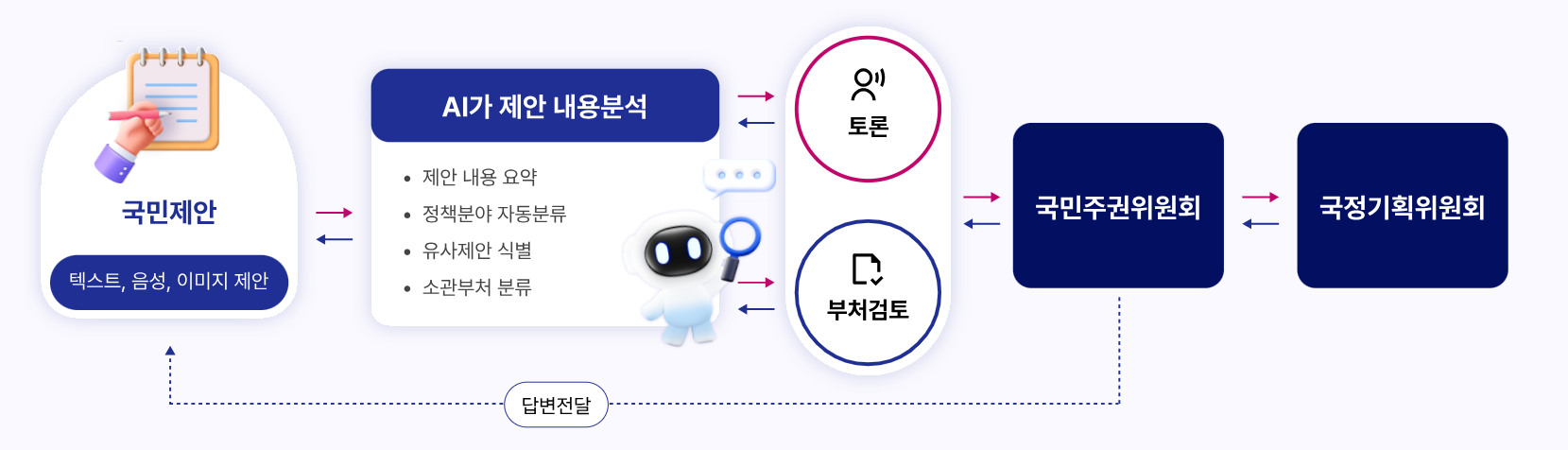 답변 내용에는 채택 여부와 함께, 채택 시 추진 일정이나 향후 계획까지 명시되어 있어, 참여자는 자신의 제안이 실제 정책으로 발전하는 과정을 투명하게 확인할 수 있습니다. 이러한 절차는 기존의 민원 처리 중심 소통 구조에서 탈피해, 국민이 정책 결정의 주체가 될 수 있도록 하는 직접 민주주의형 플랫폼으로 평가받고 있습니다. 정책 반영 시에는 참여자의 아이디어가 정부 공식 문서에 출처로 기재되며, 실질적인 정책 제안자로서 인정받는다는 점도 특징입니다.