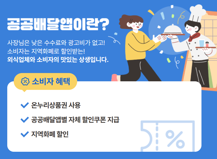 참여 공공배달앱: 배달e음, 울산페달, 배달양산, 대구로, 배달특급, 배달모아, 전주맛배달, 배달의명수, 땡겨요, 먹깨비, 위메프오, 휘파람